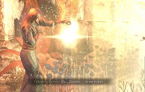 Дариен Готье: "О. Понятно... Это вполне в духе Габриэль. Дар смерти... Это был оскверненный Светоч Меридии. Прибегнув к нему здесь, в этом царстве, ты очистил его. Вернул ему истинный облик. Но что ты говорил о Кровавом Черве?"