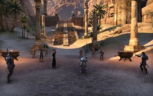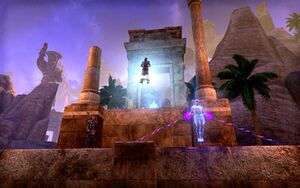 откроется открытое пространство в виде небольшого островка, окруженного пальмами и каменными колоннами. Центр островка будет выложен каменной плиткой. За островком вы увидите каменный пьедистал, на котором будет находится святилище и гореть жаровня с синим огнем.