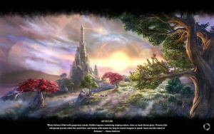 "Туманные лощины с бесчисленными никсадами. Сокрытые лагуны с поющими водами - прозрачными, словно только что выдутое стекло. Цветы, что шептали секреты при дуновении ветра, и камни, имена на которых слишком длинны для произнесения смертными. Таким был остров Артейум". - Ванус Галерион.