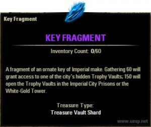 - Фрагменты ключа (Key Fragments) — Валюта используется для открытия Хранилищ трофеев (Trophy Vaults) в Имперском городе. Она может быть положена на депозит и хранится в банке.