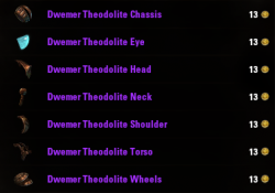 Если у вас есть золото, то вы можете приобрести каждую часть для Двемерского теодолита по отдельности. Подойдите к гильдейскому торговцу и установите в параметрах поиска значение: Другое> Трофей. Прокрутите немного вниз, и появятся продаваемые части для Двемерского теодолита. Каждая часть в среднем будет стоить 4000. Купите каждый предмет, возьмите их из почты и превратите в рунный контейнер: двемерский теодолит (питомец) (Runebox: Dwemer Theodolite Pet).