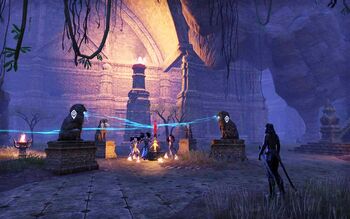 Я помог Лунной избраннице Шазе запечатать источники скверны в форте Гримвотч. Теперь нам с ее сестрой Кали предстоит исследовать раскопанный каджитский храм. Как и ожидалось, я сумел рассеять барьер. Теперь мы можем войти в храм.