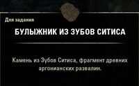 Ниссво Уаксал, жрец Ситиса, хочет создать монумент, чтобы восславить Ситиса и связь своего народа со стремлением к изменениям. Надо собрать несколько фрагментов аргонианских руин для монумента. Найти эти руины можно в Зубах Ситиса, пещере Цофир и гробнице Многих Копий.