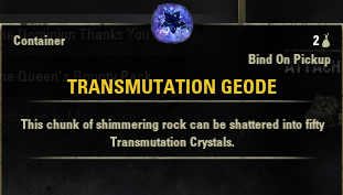 Жеода трансмутации (Transmutation Geode) является контейнером с 50 Кристаллами трансмутации. Может быть получен в качестве награды в кампаниях Сиродила. Он связывается к персонажу. При открытии контейнера все кристаллы трансмутации привязываются к аккаунту.