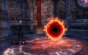 Когда вы пройдете дальше, то увидите открытый даэдрический портал и боевого мага, защищающий его. Он крикнет: