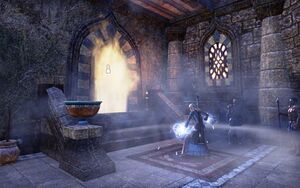 Во время движение, вы будете отбиваться от нападение Громил Иссохшей Длани (Withered Hand Brute), Освященных мастеров меча (Consecrated Swordmaster) и других членов культа Иссохшей Длани. Когда вы окажитесь в большом зале, где раньше лежали обереги ансеев, то вы поймете, что оберегов здесь уже нет. Вы заметите призрака, стоящим перед каменными скульптурами, местом нахождения оберегов. Поговорите с ним.