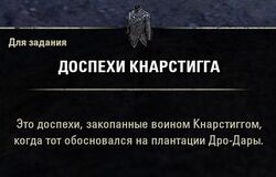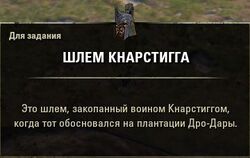 - Кнарстигг: Может быть. Если бы мои броня, шлем и топор были у меня, я бы все сделал сам, но в том и проблема. Когда мы здесь поселились, я закопал все свое снаряжение искателя приключений там, у берега. Сможешь найти его и принести мне?
