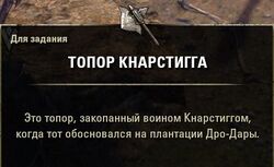 - Кнарстигг: На вид, может, и не впечатляет, но эти шлем и броня выдержали удары Накдула, военачальника орков и убийцы нордов в Фарруне. А топор снес уродливую голову этого чудовища! Я выпью за те деньки. И за то, чтобы настали такие же!