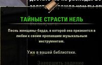 Лейборн: "Совершенно верно! «Тайные страсти Нель» подскажут тебе, где их искать. Когда будешь странствовать по Скайриму, гляди в оба — и держи ушки на макушке. Ведь мы ищем не что-нибудь, а музыкальные инструменты. Если найдешь что-то еще, я буду здесь."