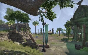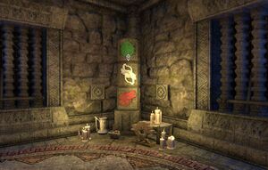 В углу находится каменный столб с вращающимися секциями. Вам нужно будет нажимать на декоративные настенные плитки, чтобы вращать эти части. Крайняя левая настенная плитка перемещает верхний и средний сегменты, средняя плитка перемещает все три, а крайняя правая плитка перемещает верхний сегмент. Для решения задачи на вершине столба должно быть зеленое яйцо, в середине — белый символ, а внизу — красная голова аргонианца.