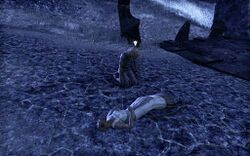 Кулон (Pendant) теперь будет лежать в вашем инвентаре, и вам нужно будет найти хотя бы одно из имен, выгравированных на кулоне. Если вы ранее говорили с Ахирунзом, то вы будете знать, где найти одного из них. Следуйте по дороге от Пещеры трофеев, пока не дойдете до главной дороги. Затем идите вдоль него на запад, пока не найдете каджита, оплакивающего тело другого.