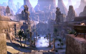 откроется открытое пространство в виде небольшого островка, окруженного пальмами и каменными колоннами. Центр островка будет выложен каменной плиткой. За островком вы увидите каменный пьедистал, на котором будет находится святилище и гореть жаровня с синим огнем.