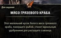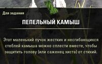 Заша-Джа: "Раздобудь предметы, которые я просила, если желаешь нам помочь. Пепельный камыш растет в заводях в нашем квартале, а грязевые крабы обитают на берегу поблизости. Собери всего этого понемногу и выложи на корнях нашего хиста."