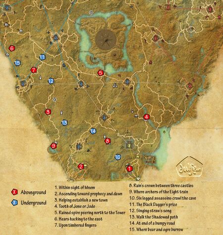 Всего в Сиродиле можно найти 46Небесных осколков, которые разделены по 15 осколков на каждую территорию Альянсов и 1 осколок, находящийся на вершине White Fall Mountain на Территории Пакта.
