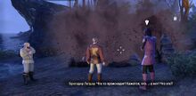 Встретьтесь с Ревусом на холме по направлению к городу, и вы увидите бригадира Латдара и Манора Мобанера, угрожающих данмерам: