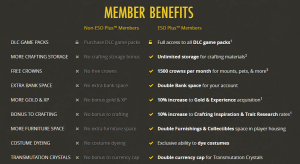 Членство в ESO Plus предлагает эксклюзивные внутриигровые бонусы, выплату корон и доступ к пакетам DLC в течении активного членства: